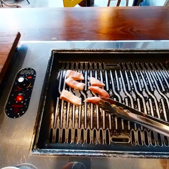 석쇠는 돼지기름으로 먼저 발라주고 고기를 구워줍니다.