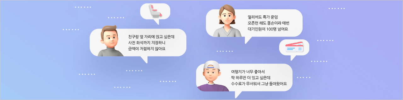 셋, 여행의 즐거움은 최대로! 여정 변경 부담은 ZERO프리미엄, 프리미엄플러스 회원이라면 수수료 폭탄 걱정없이 여정 변경이 가능합니다.